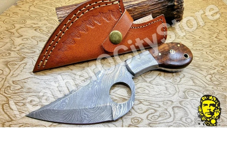 Custom Handmade Damascus Steel finger hole skinning knife with awesome sheath