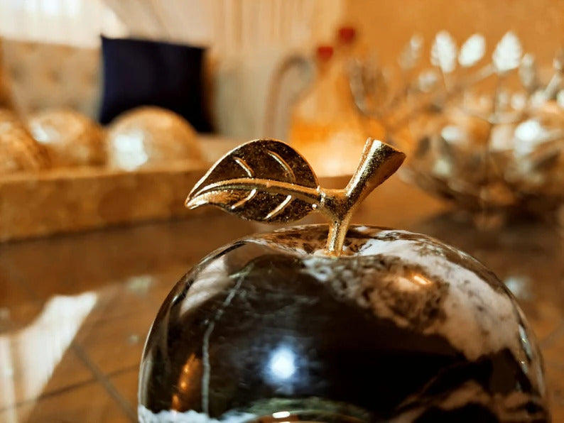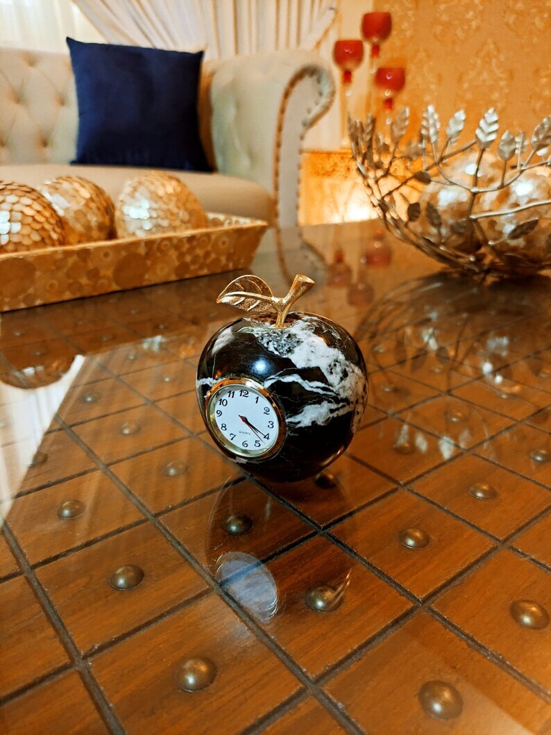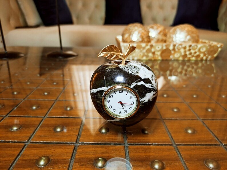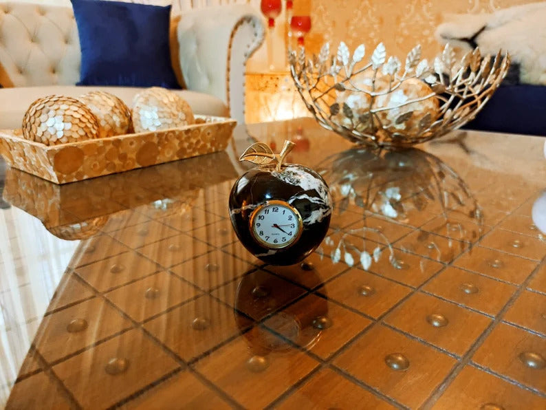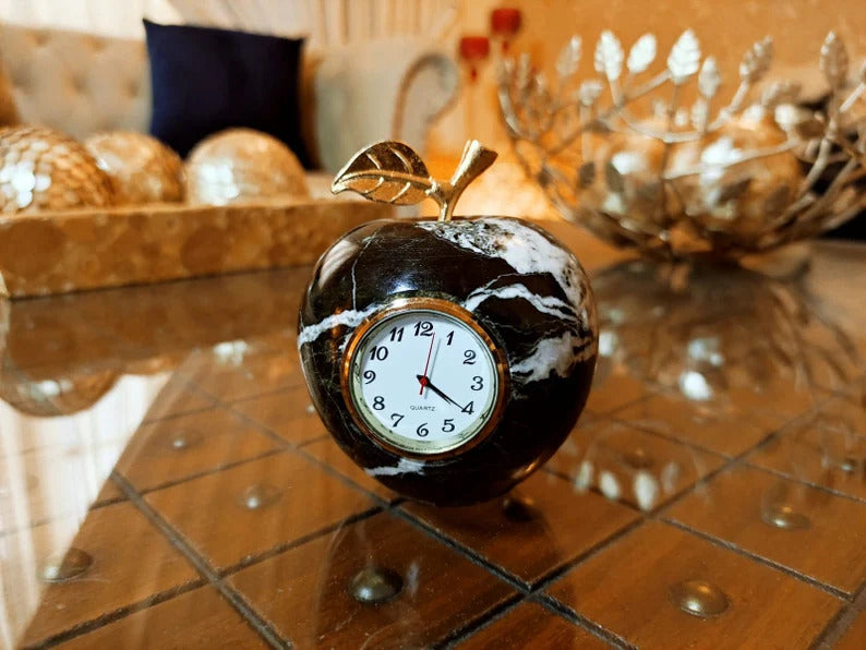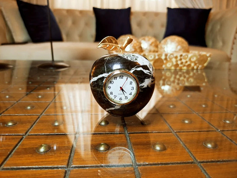 Black Apple Marble Hand Made Table Clock, Marble Home Decor, Living room Figurine, Natural Stone Onyx, Office Decor, Marble Clock Antique