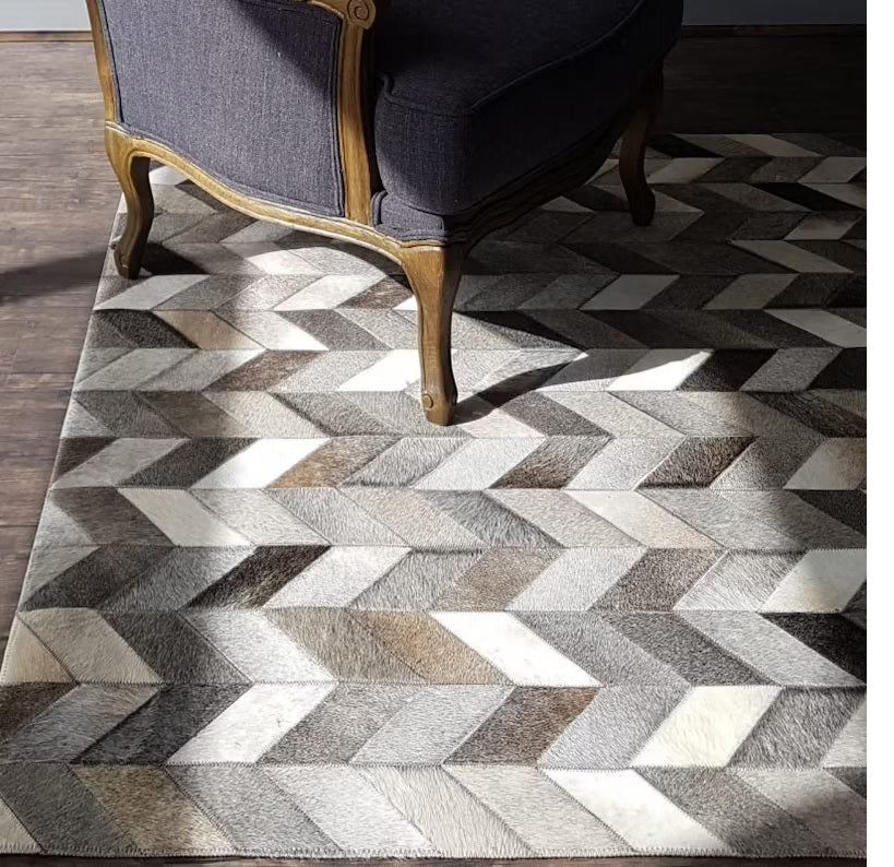 Cowhide Patchwork Rug Natural Grey Tone Chevron Cowhide Leather Carpet - Cowhide Area Rug