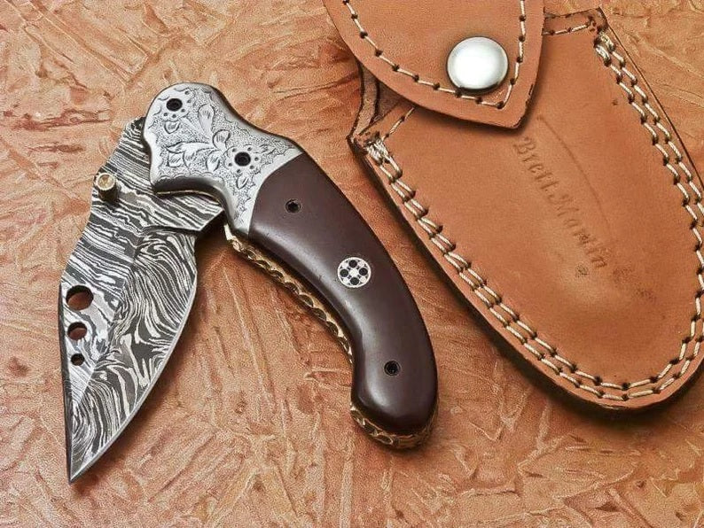 Damascus Folding Knife with sheath micarta handle and steel engraved bolsters Custom Pocket Knife Anniversary Gifts Damascus Steel Blade