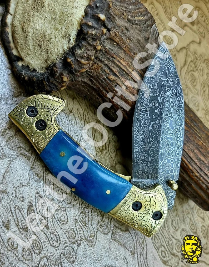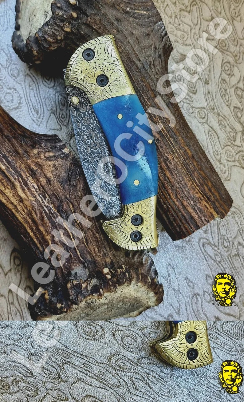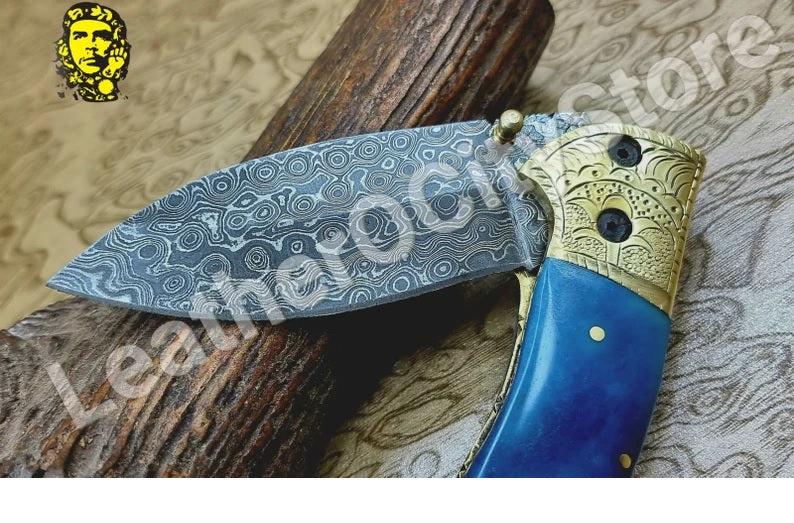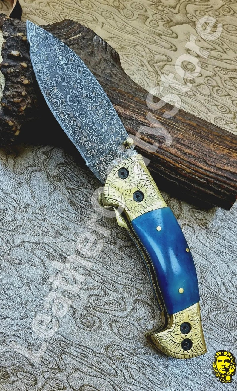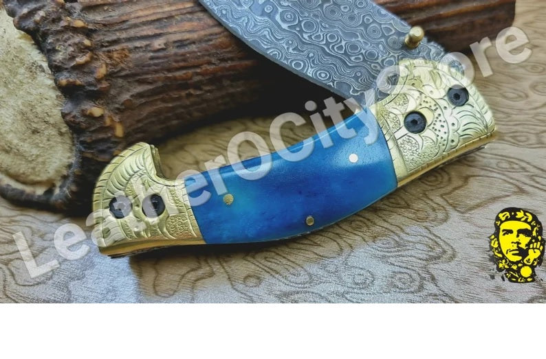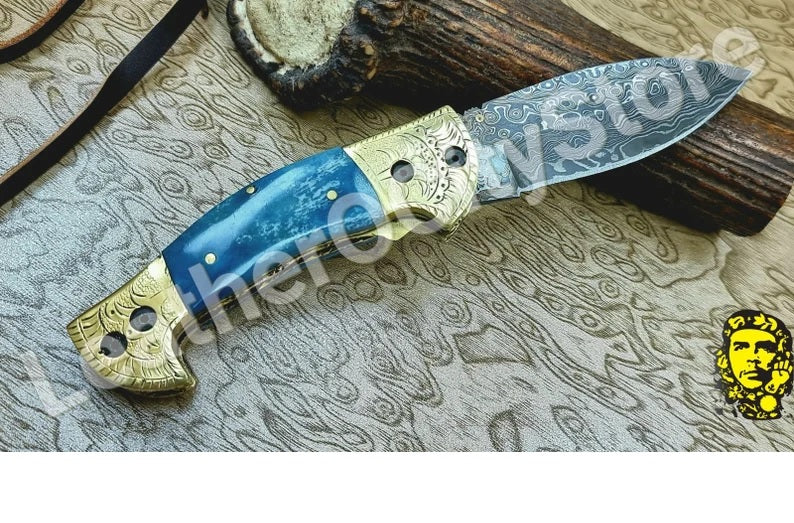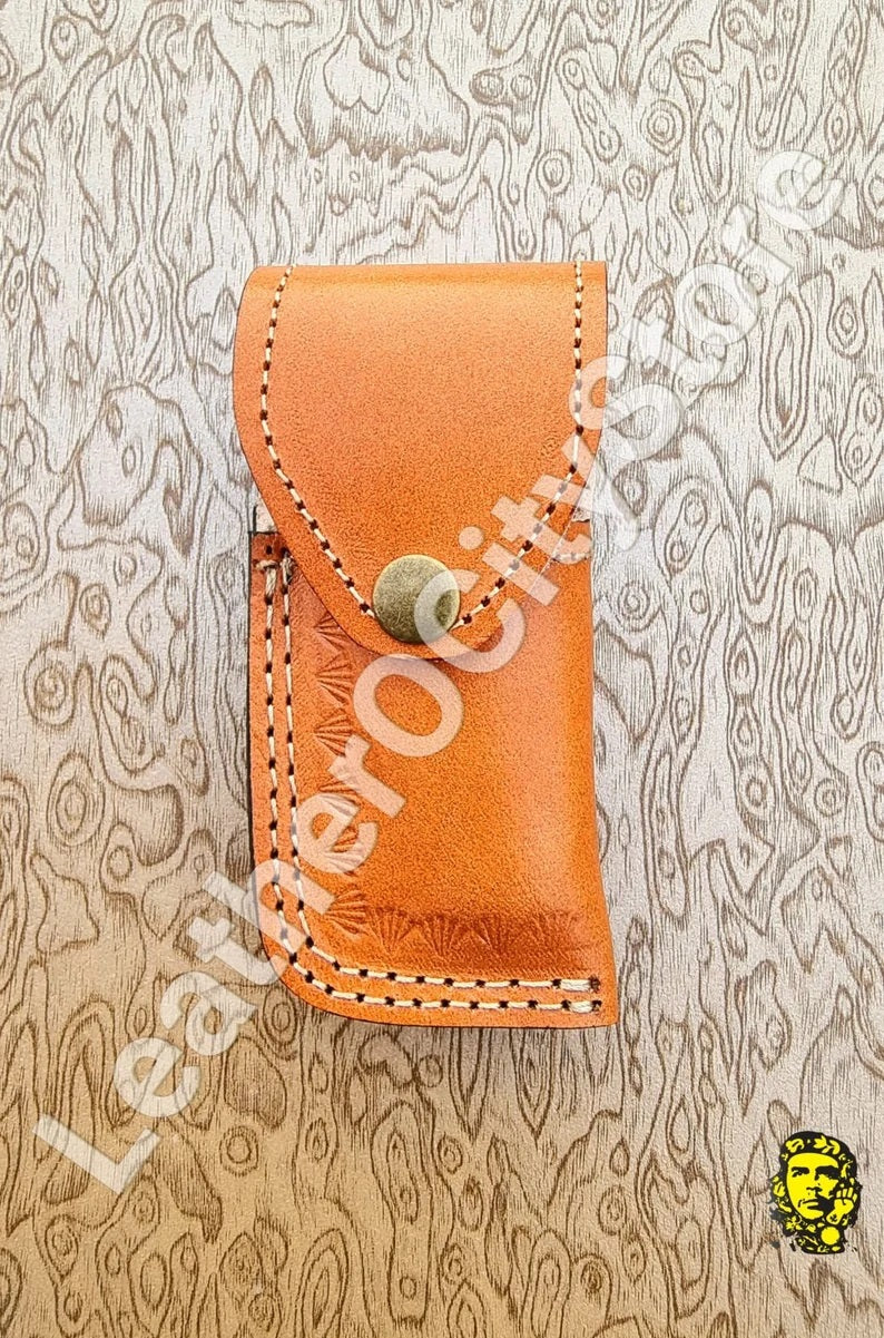 Handmade Custom Damascus Steel Folding Pocket Knife with Genuine Leather Sheath.