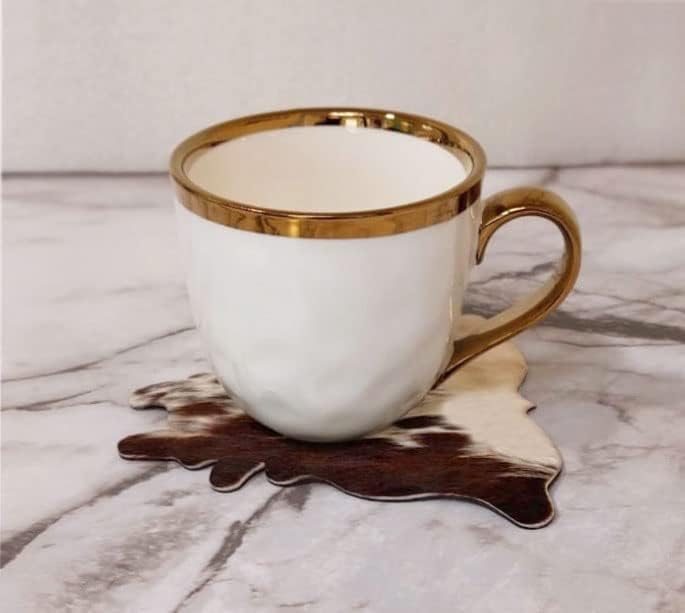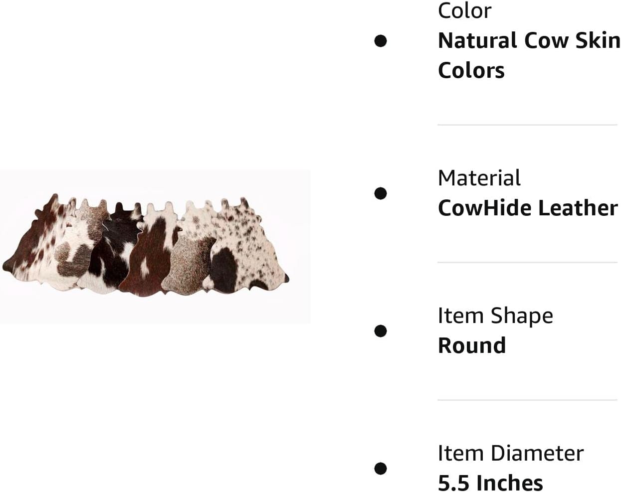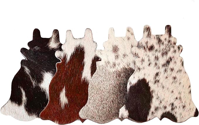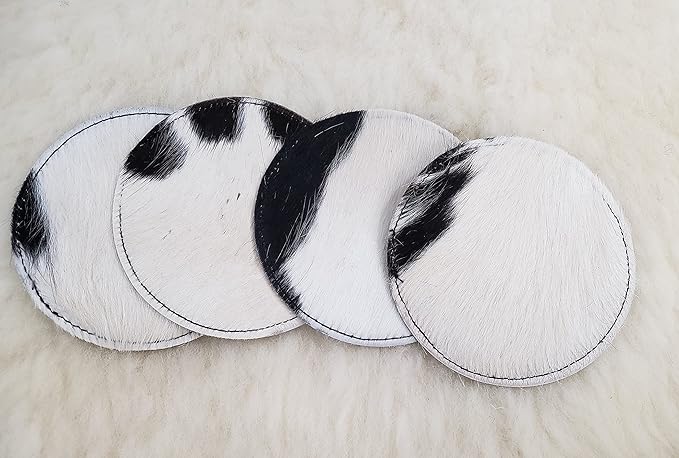 These unique western hair-on coasters are made of genuine leather. The coloring is natural, not dyed or stained. Each cowhide coaster is cut out by hand from premium hides. The bottom of these coasters is very soft and won't scratch any surface you may use them on.