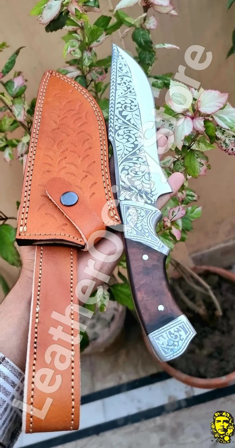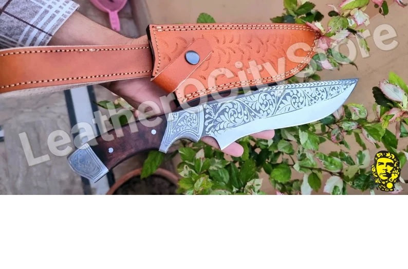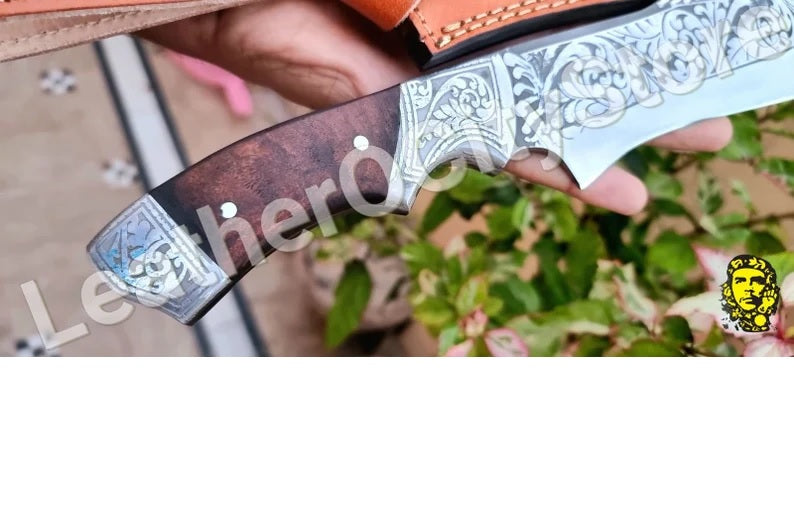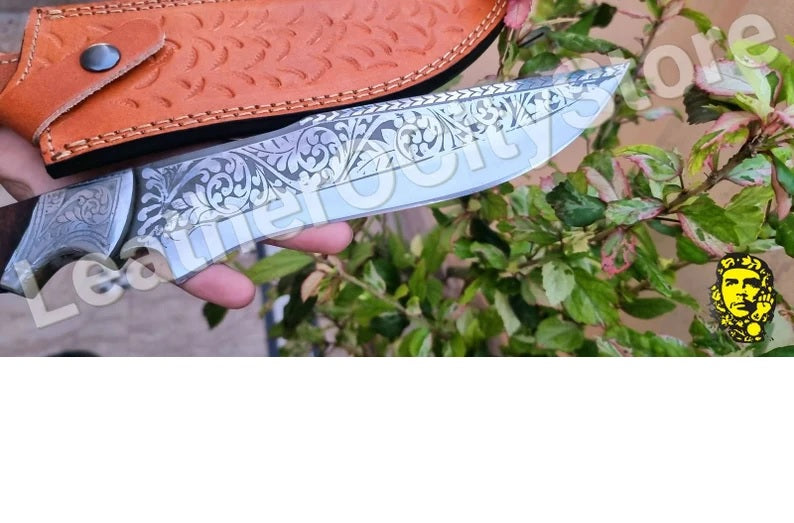 Custom Handmade D2 steel hand engraved bowie/hunting knife with leather sheath