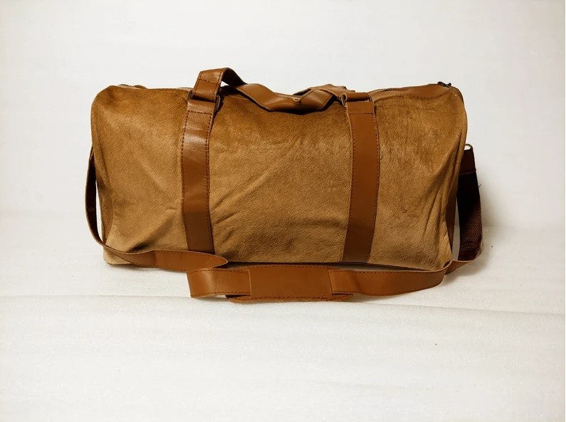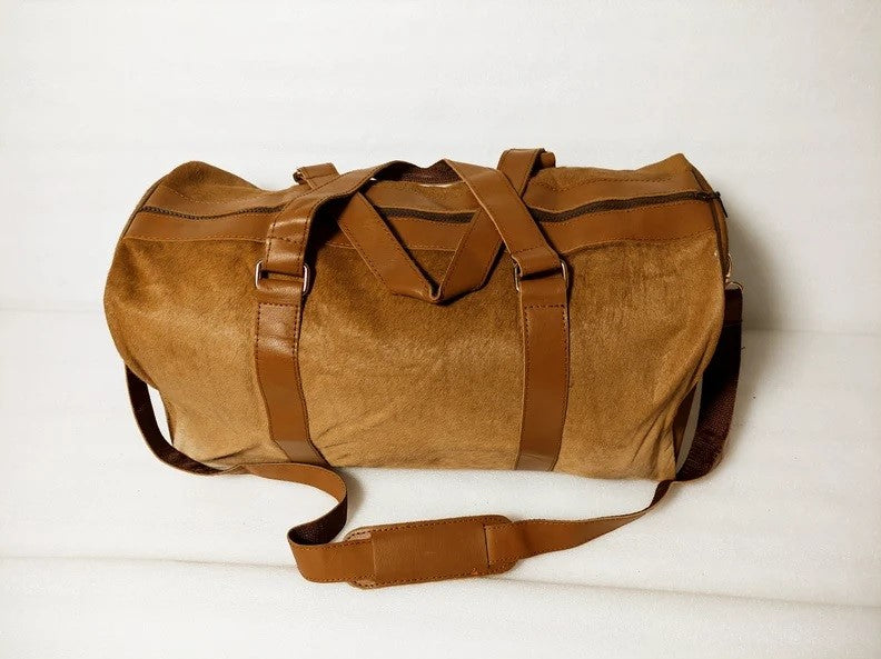Real Cowhide Leather Duffel Bag Brown Natural Cow Skin Fur Overnight Weekender Travel Gym Bag