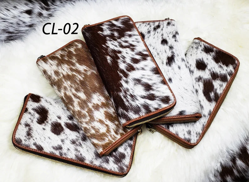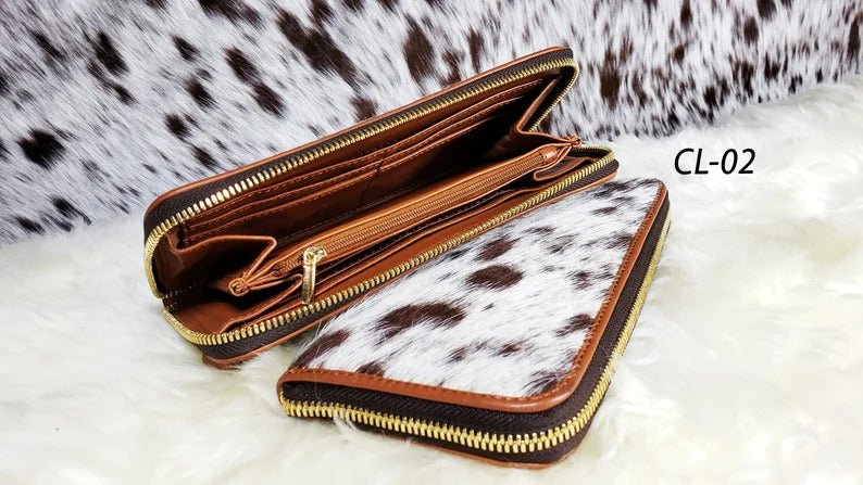 Real Cowhide Wallet Genuine Leather Handmade Wristlet and Zipper Wallet, Fur Purse Wallet, Handbag, Organist for women.
