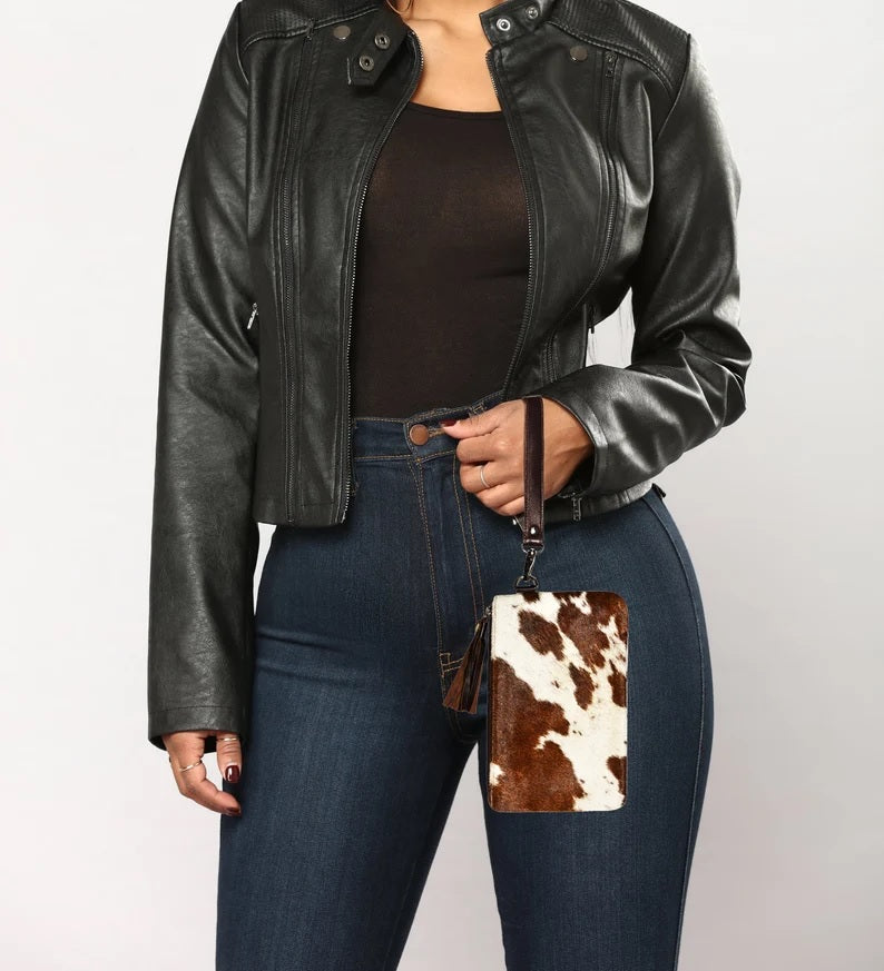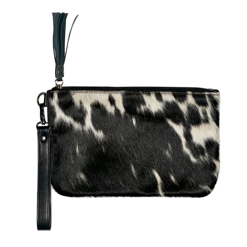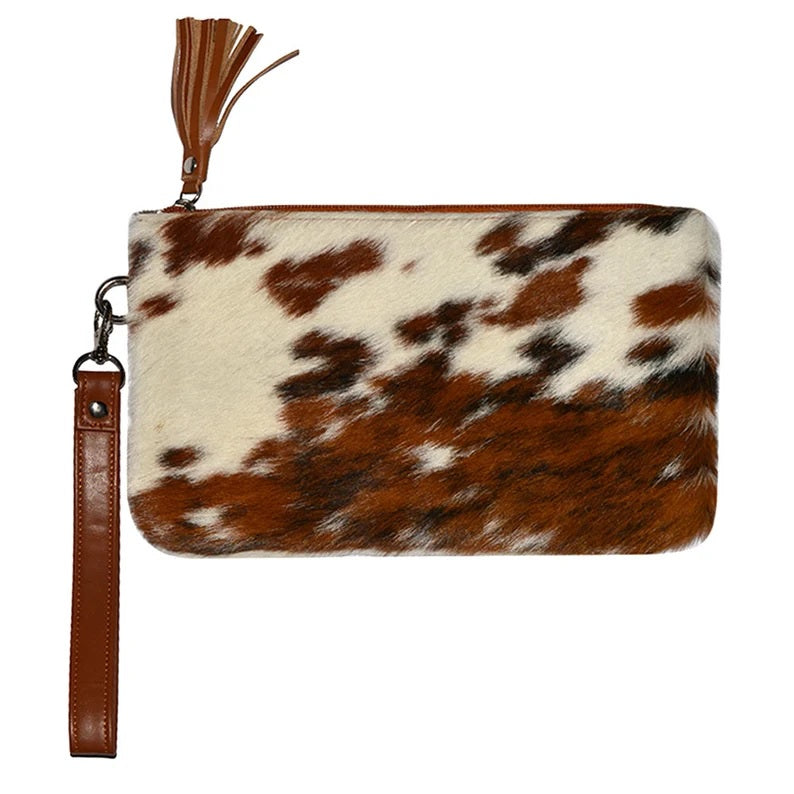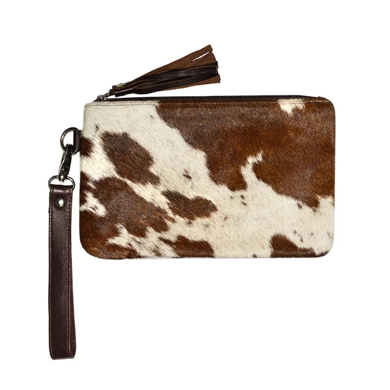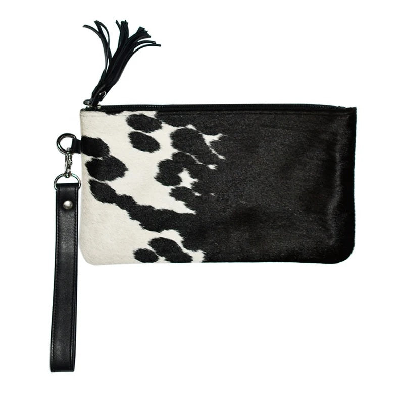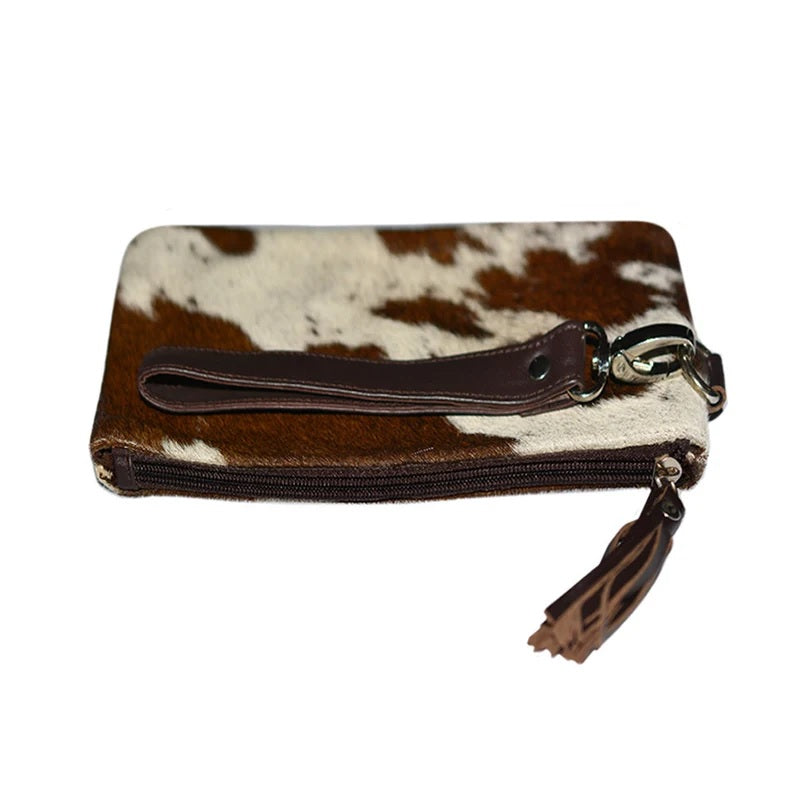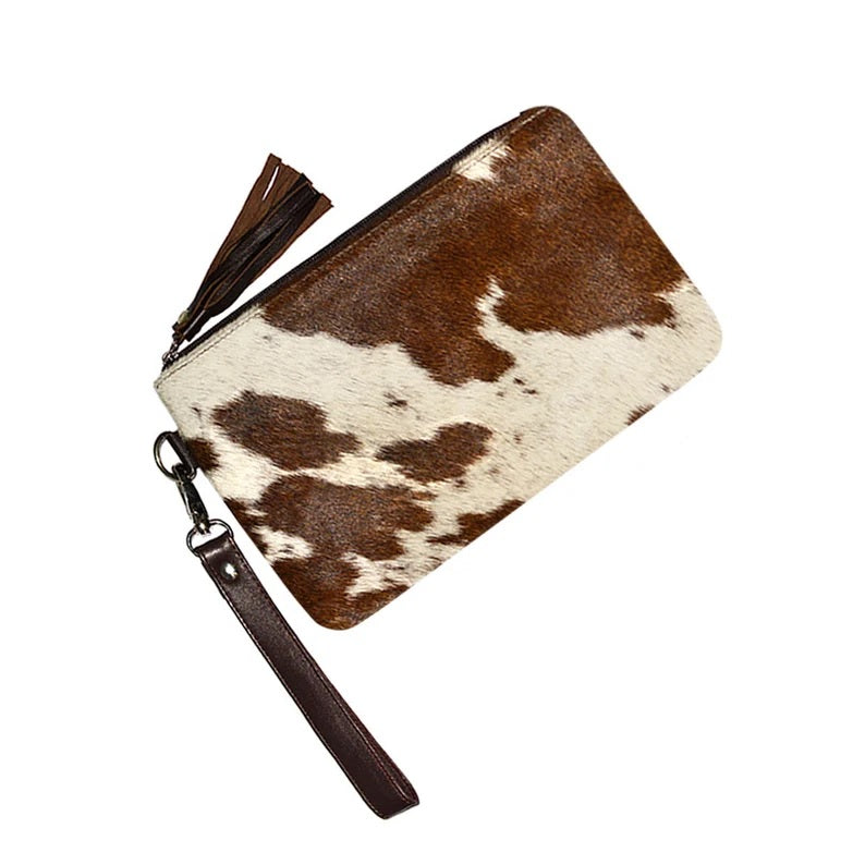 Real Cowhide Clutch Genuine Leather Handmade Wristlet, Zipper and Tassel Clutch, Fur Purse Wallet, Handbag, Organiser for women
