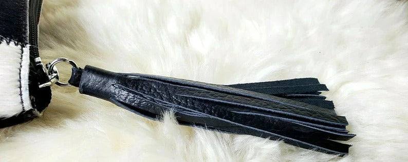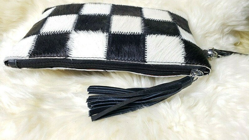Real Cowhide Patchwork Clutch Genuine Leather Handmade Wristlet, Tassel and Zipper Clutch, Fur Purse Wallet, Handbag, Organiser for women