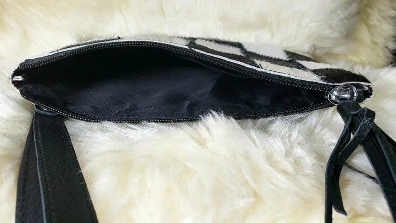 Real Cowhide Patchwork Clutch Genuine Leather Handmade Wristlet, Zipper, and Tassel Clutch, Fur Purse Wallet, Handbag, Organist for women.