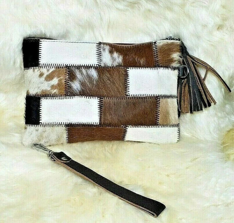 Real Cowhide Patchwork Clutch Genuine Leather Handmade Wristlet, Zipper, and Tassel Clutch, Fur Purse Wallet, Handbag, Organist for women.