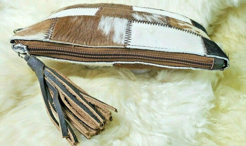 Real Cowhide Patchwork Clutch Genuine Leather Handmade Wristlet, Tassel and Zipper Clutch, Fur Purse Wallet, Handbag, Organiser for women