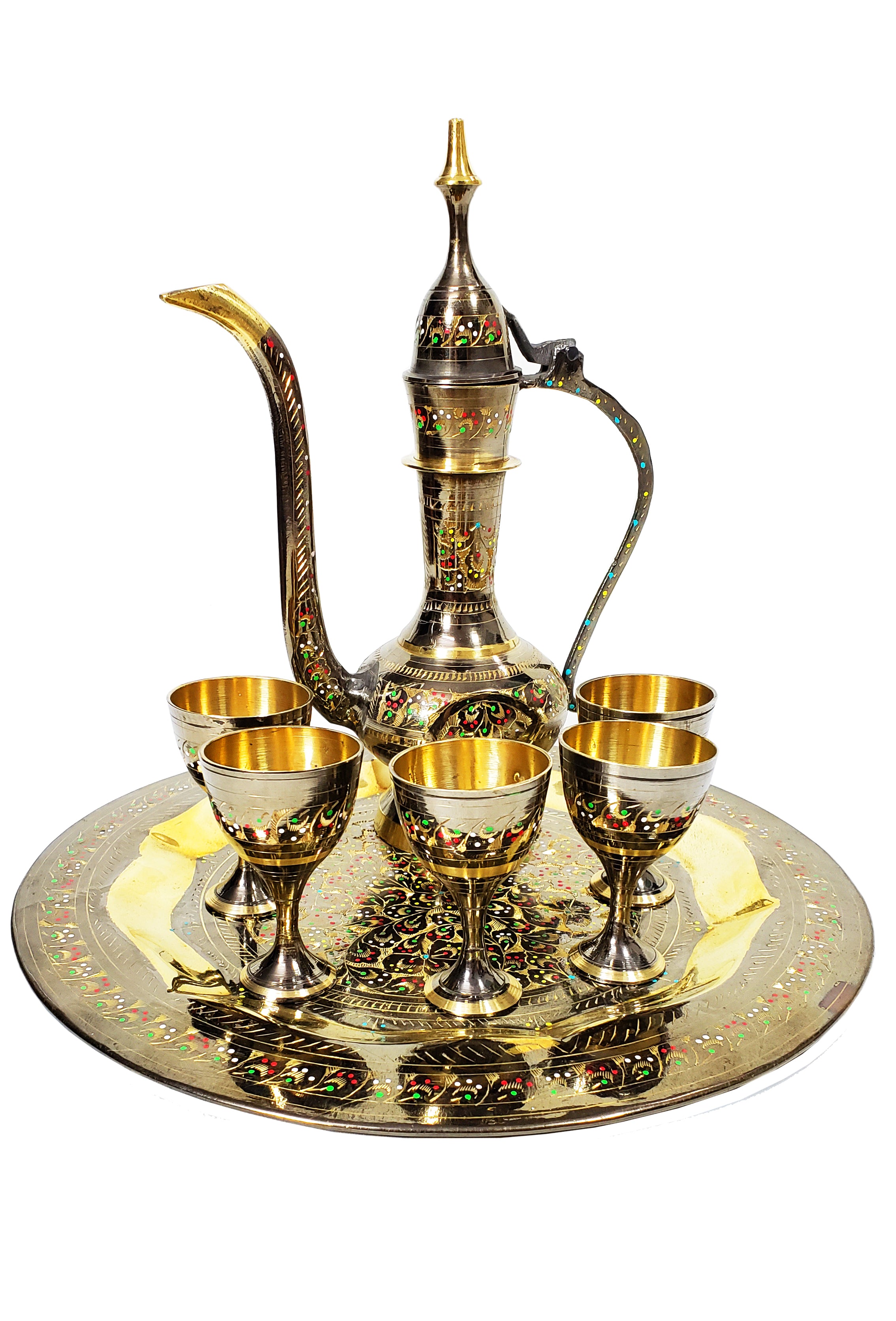 Vintage Antique Style Handmade Brass MOROCCAN Tea Set, Brass Coffee Pot, Matching Brass Cups Goblets, Hand Engraved Polished & Etched
